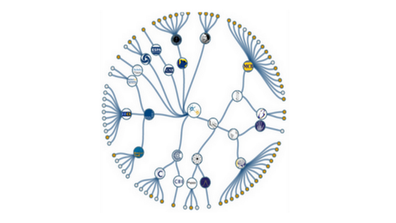 interactive visualization of the 12 departments that house HWNI faculty. Members of HWNI are indicated in orange. Go to website to interact with visualization